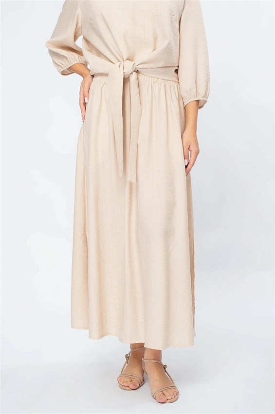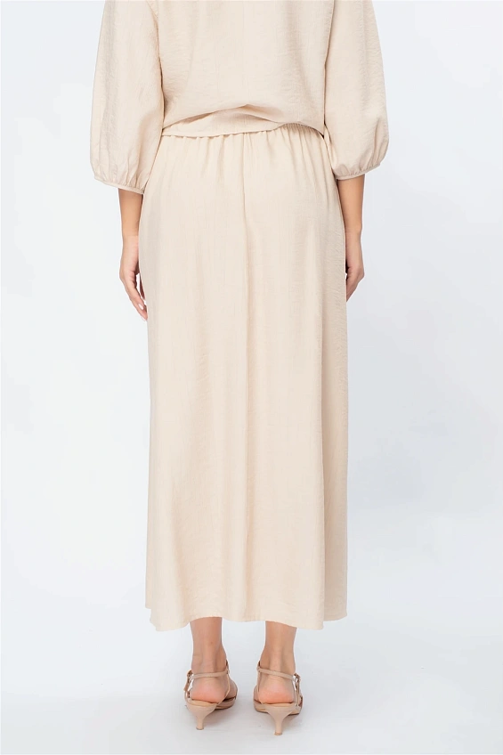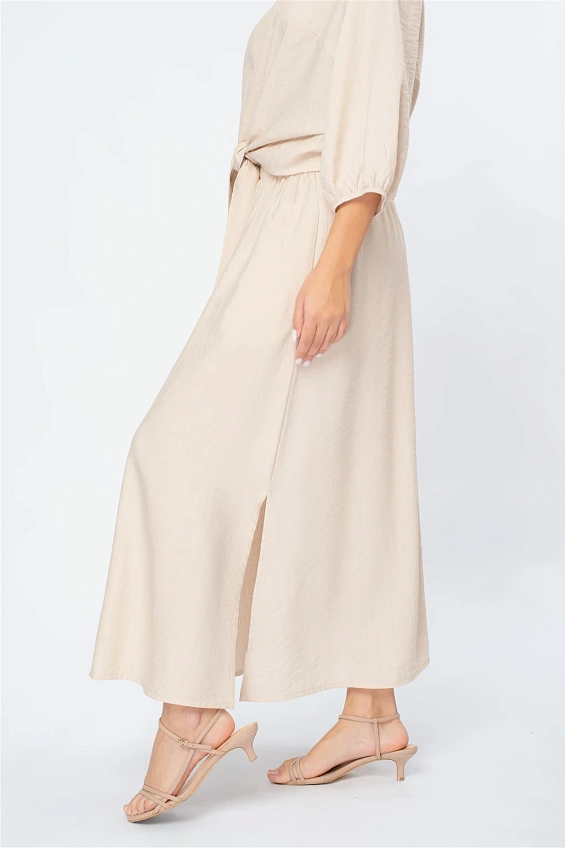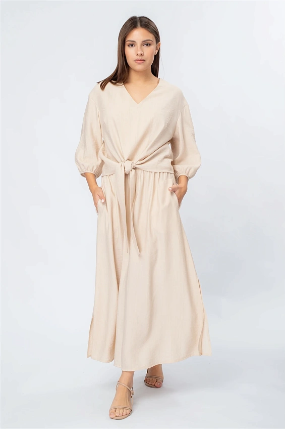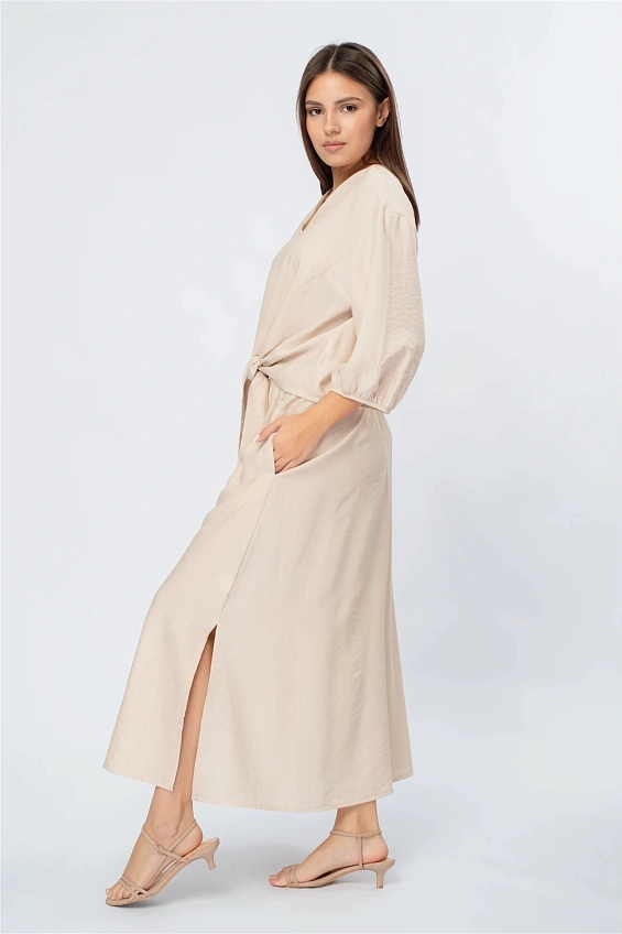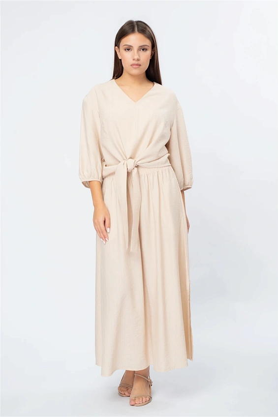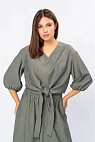 Блузка выполнена с аккуратным V-образным вырезом, который визуально удлиняет силуэт. Объёмные рукава длиной 3/4 с мягкой сборкой по низу придают образу лёгкость и современный характер.