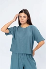 Модель выполнена с классическим круглым вырезом и короткими рукавами, обеспечивающими комфорт в тёплую погоду. Свободный, слегка укороченный силуэт придаёт образу лёгкость и современный вид.