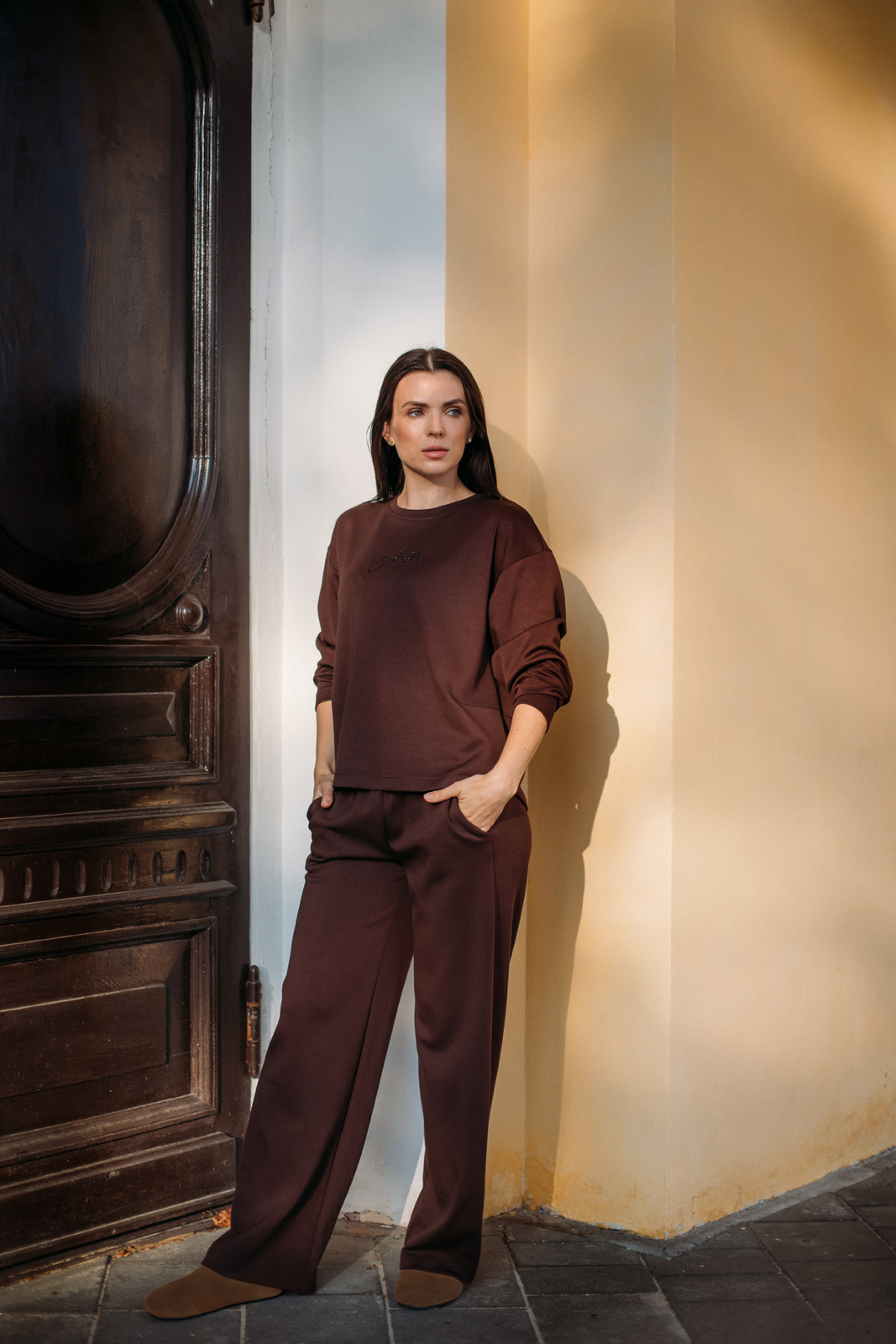 Капсула создана для комфортной атмосферы на работе и неспешных прогулок на свежем воздухе. Фокус на функциональность и приглушенную красоту природных оттенков. Это одежда как «уютный кокон» для тела и души, защищающий от суеты, но не отключающий от мира. Теплые коричневые оттенки разбавлены зеленью хвойного леса, цветом темнеющего неба и последними сиреневыми отсветами заката.