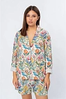 Женский жакет свободного кроя с ярким цветочным принтом. Выполнен из лёгкой ткани в светлой базе с растительным узором.
