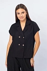 Модель с отложным воротником и двубортной застёжкой на контрастные пуговицы. Силуэт прямой, слегка укороченный, с мягкой линией плеч.